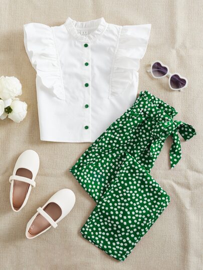 SHEIN Leap Crew Omgiven Krås Paperbag-Midja Blommig Söt Flickors Tvådelade Outfit - Multifärgad - Visa 1