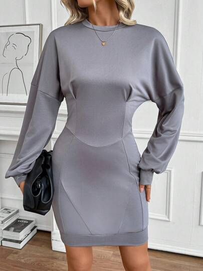 SHEIN LUNE Kvinnors eleganta passformade puffärm Sweatshirtklänning med rund hals - Grå - Visa 1