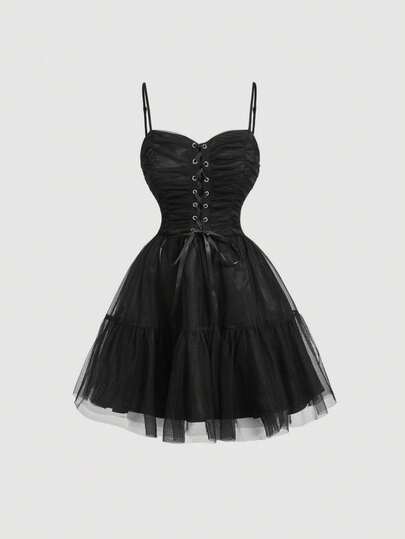 SHEIN MOD Black Tulle Corset Mini Dress, Ruched Mesh Fabric, Gothic Party Dress, Wedding Guest Dress, Prom, Evening Cocktail, Puffy Skirt, Sleeveless, Lace Up Front, Elegant, Retro, Vintage Style, A-Line, Sexy, Chic, Layered, Sweetheart Neckline, Little Black Dress, Homecoming, Graduation, Birthday, Dinner, Formal, Event, Reception, Celebration, Bridesmaid, Fashionable, Edgy, Y2K Style, Night Out, Stylish, Textured, Statement Piece, Special Occasion - Black - View 1