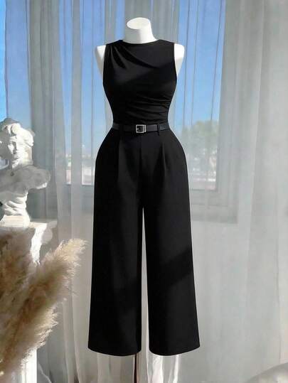 SHEIN MOD Plus Size 1pc Women's Black Pleated Wide Leg Loose Jumpsuit With Belt, Casual Style,New Year,Valentine.Sophisticated Women's Black Jumpsuit Sleeveless Boat Neck With Belt And Wide Leg For Versatile Styling.Spring And Summer Outfits - Black - View 1