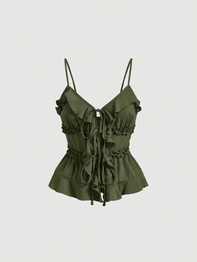 SHEIN MOD Summer Army Green Bodycon Ruffle Cup Wireless Bralette With Front Knot And Back Straps - Army Green - View 1