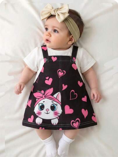 SHEIN Nyfödd baby tecknad katt & hjärtmönster rund hals kortärmad casual klänning - Svart och Vitt - Visa 1