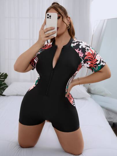 Swim SPRTY Dragkedja Blommig Boho Plus Size One-Piece - Svart - Visa 1