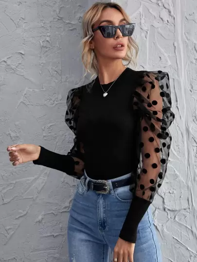 SHEIN Privé Dobby Mesh Sleeve Rib-Knit Black Top - Black - View 1