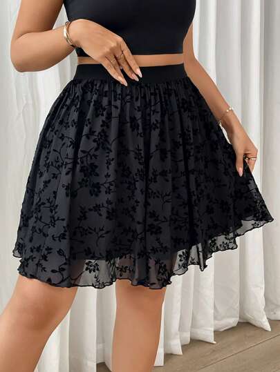 SHEIN Privé Plusstorlek Elastisk midja, blommig utsvängd minikjol, bekväma avslappnade Elegant strandkläder, stretchigt tyg, lämplig för pendling, vår/sommar - Svart - Visa 1