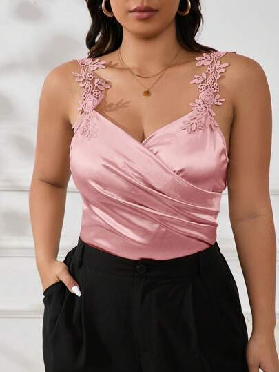 SHEIN Privé Plus Size Elegant Women's Lace Applique Spaghetti Strap Surplice Neck Ruched Waist Slim Bodysuit, Suitable For Work, Date, Afternoon Tea - Dusty Pink - View 1