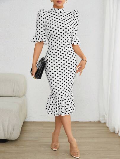 SHEIN Privé Polka Dot Print Flare Sleeve Mermaid Hem Dress - White - View 1