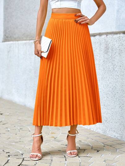 SHEIN Privé Women's Solid Color Elastic Waist Pleated Elegant Commuter Skirt - Orange - View 1