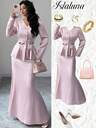 Rafferiza Elegant Bodycon Fishtail Hem V-Neck Waist Pleated Knit Mesh With Rose Red Lining Long Dress For Women, Autumn/Winter Fall Cloth For Women