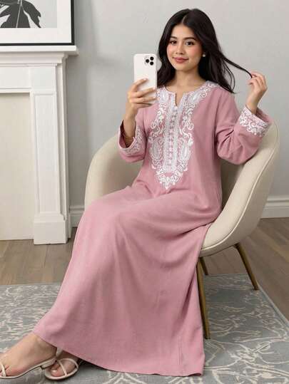 SHEIN Ramadan Ny Lös Avslappnad Rund Hals Mönster Långärmad Morgonrock För Tonårsflickor, Rosa Morgonrock, Traditionella Arabiska Klädsel, Kaftan, Jalabiya, Abaya Morgonrock, Ramadan, Matchande Syster, Mor-Dotter - Rosa - Visa 1