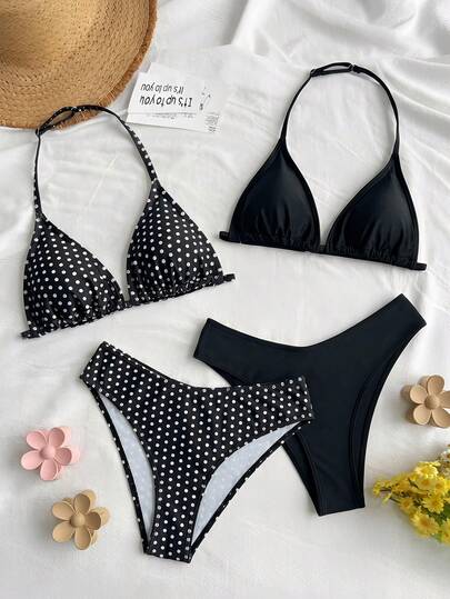 SHEIN Teen Girl 2 Pieces Polka Dot Pattern + Solid Black Camisole Bikini Set, Summer Beach Vacation