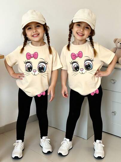 SHEIN Småbarnsflickor Avslappnad Söt Tecknad Katt & Djurtryck Kortärmad T-shirt Och Leggings 2-Delat Set - Multifärgad - Visa 1