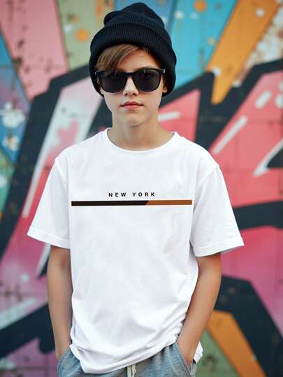 SHEIN Tween Boy Teenage Casual Simple Letter Printed Short Sleeve T-Shirt, Spring/Summer Summer Holiday - White - View 1