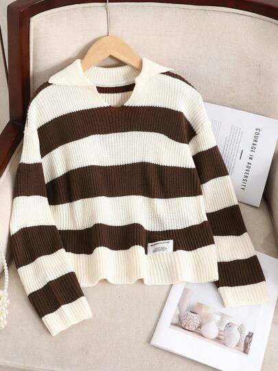 SHEIN Avslappnad ribbad polotröja för tweenflickor, collegestil, höst/vinter - Brun - Visa 1