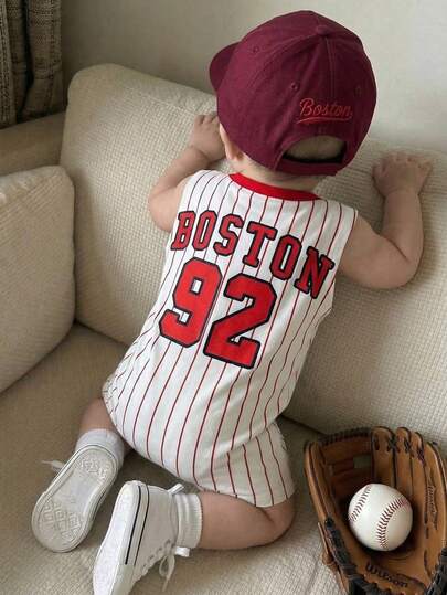 SHEIN Unisex Baby Cute Red Sleeveless Romper Jumpsuit Baseball Jacket, Spring/Summer Baby Boy Clothes, Outfits Baby Boys Baseball Clothing Baseball Jersey Baby Jersey Baby Boy Boy Baby Clothes Unisex Baby Clothes
