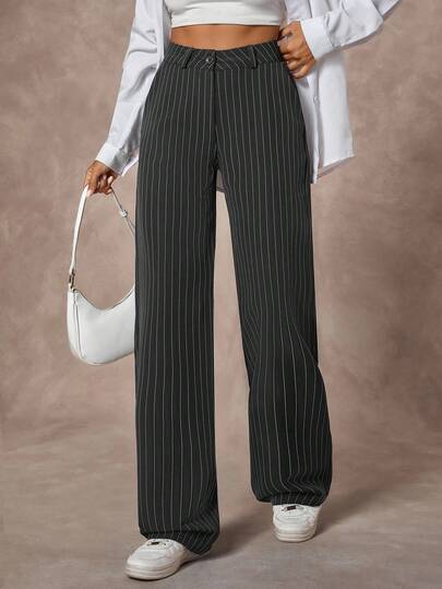 SHEIN Women's Navy Blue Striped Straight Fit Button Front Elegant Suit Pants - Navy Blue - View 1