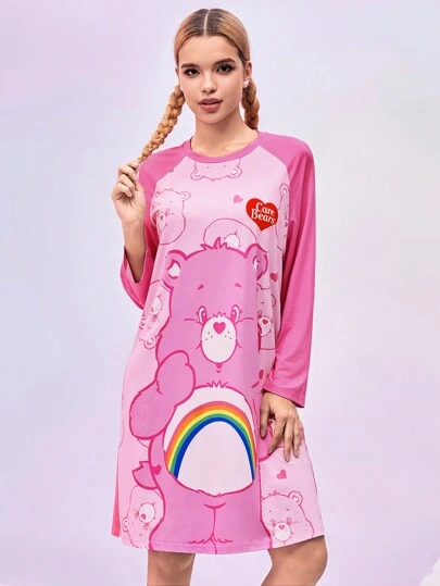 SHEIN X Care Bears Cheer Bear Rosa raglanärmad lös sömnklänning, söt och gullig hjärtmönster långärmad sömnklänning, höst & vinter, Moo Moo nattklänning - Rosa - Visa 1