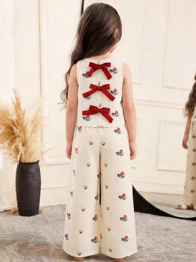 SHEIN Young Girl Ditsy Floral Bow Decor Camisole And Wide Leg Pants Set - Multicolor - View 1