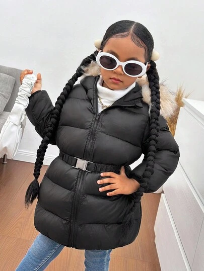 SHEIN Söt och mångsidig svart vadderad kappa med termofoder för unga flickor, lämplig för höst/vinter - Svart - Visa 1