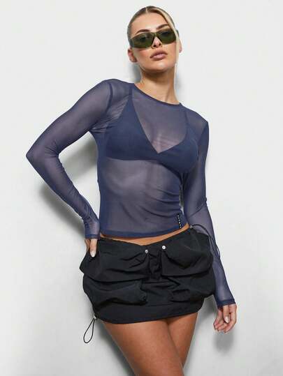 SUMWON WOMEN Långärmad, transparent nättopp med inbyggd BH för lager-på-lager-kläder - Marinblå - Visa 1