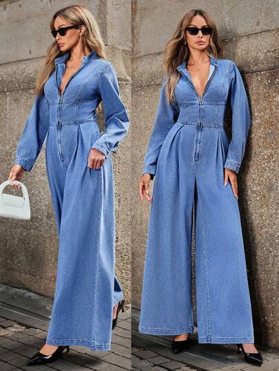Selenza Damjumpsuit med raka ben och normala axlar, långärmad och rynkad midja - Blå - Visa 1
