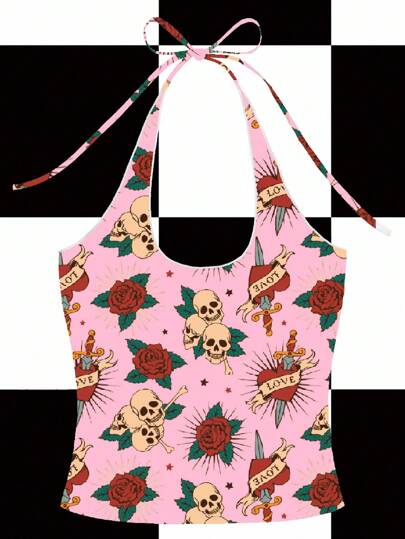 Shutterstock Women's Skeleton & Floral Print Fashion Halter Neck Tank Top Pink Top Skull Print Top Rose Print Top Tattoo Print Top Pink Halter Top - Pink - View 1