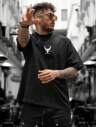 Shwiy Herr minimalistisk svart kortärmad t-shirt med remmar och grafiskt tryck med siffran "7", lämplig för skolan, vardagskläder, streetwear