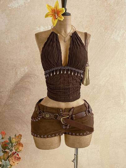 Soleia Women's Vintage Textured Halter Neck Backless Tank Top, Summer
