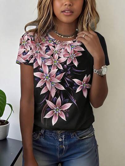 Spring/Summer New Vintage Floral Print Short Sleeve T-Shirt, Women Casual Loose Fit Round Neck Tops, Versatile Commuting Ins Style Vacation Black