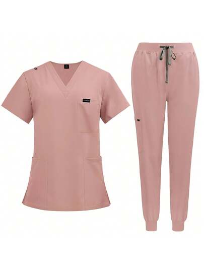 Stylish 2 Pieces Set, Elegant Short Sleeve V-Neck Nursing Scrub Top & Cinched Waist Pants Scrub Uniform Suit, For Women, Scrub Uniform Set - Pink - View 1