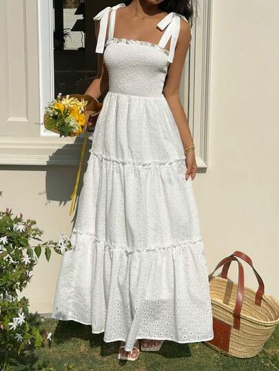Sunnyshic Vit maxiklänning med spaghettiband och snörning, broderad A-linjeformad klänning för kvinnor, romantisk och elegant modesemester och strandklänning för utflykter, dejter, födelsedagar, bröllop, vår/sommar - Vitt - Visa 7