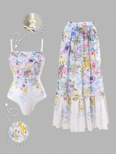 Swim Oasis Dambaddräkt i ett stycke med fyrkantig halsringning, spaghettiband, meshkjol, elegant och avslappnad stil för semestern - Multifärgad - Visa 1