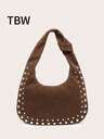 Damaxelväska med halvmåne, enfärgad mocka, stor kapacitet med nitdekoration. Mångsidig axelväska i vintagestil för pendling och utflykter.