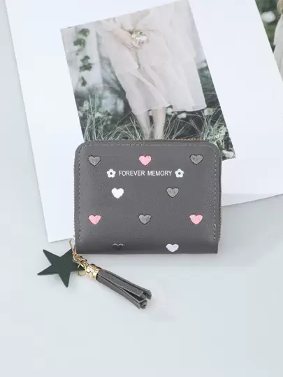 Tassel Decor Heart Graphic Small Wallet - Dark Grey - View 1