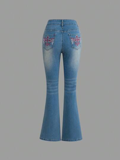 SHEIN Explorewe Teen Girl Vintage Rhinestone Cross utsvängda jeans - Ljustvätt - Visa 1
