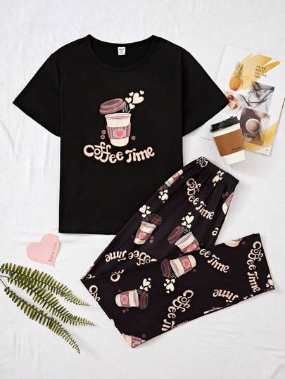 Teen Girls' Full Print Coffee Patterned Pants & Short Sleeve T-Shirt Set With Coffee Print Front, Casual Homewear - Black - View 1