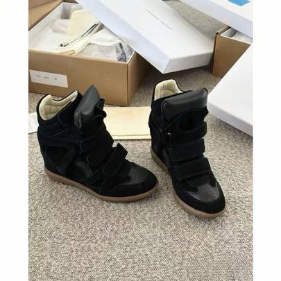 The New 2026 Wedge Sneakers Combine Beige Suede And Leather, With A Retro High-Top Design And A Practical Closure. A Hidden 5cm Wedge Heel Provides Added Height And Comfort, Ideal For Everyday Wear And Casual Occasions. - Black - View 1