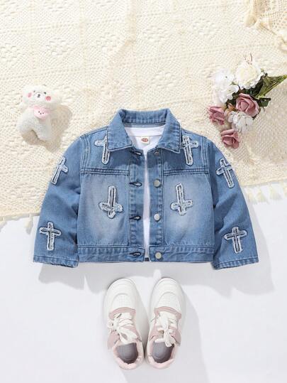 Toddler Girls Street Chic turndown krage Kort Casual Broderad tvättad jeansjacka - Mediumtvätt - Visa 1
