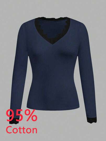 Tseoso Avslappnad, djup V-ringad, spetskantad, åtsittande långärmad t-shirt, lämplig för höst/vinter - Blå - Visa 1