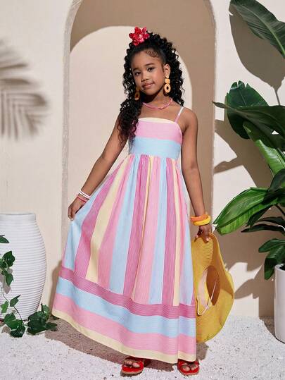 Tween Girl Fashion Resort Pink Spaghetti Strap A-Line Dress
