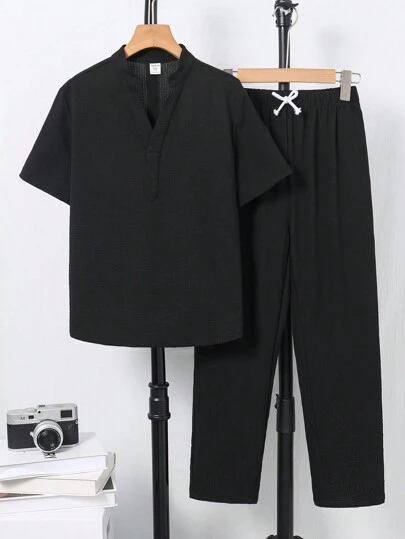 Tween Boy Casual Ribbad Tyg Kortärmad Skjorta Och Långbyxa Set, Lämplig för pendling, Skola, Daglig Casual, Sport, Vår/Sommar - Svart - Visa 1