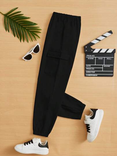 SHEIN Tween Boys' Casual Elastic Waistband Flap Pocket Cargo Pants - Black - View 1