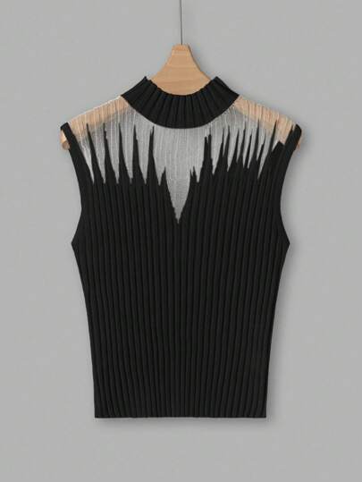 Uhlyne Dam står krage Mesh Kontrast Ribbstickat linne - Svart - Visa 1