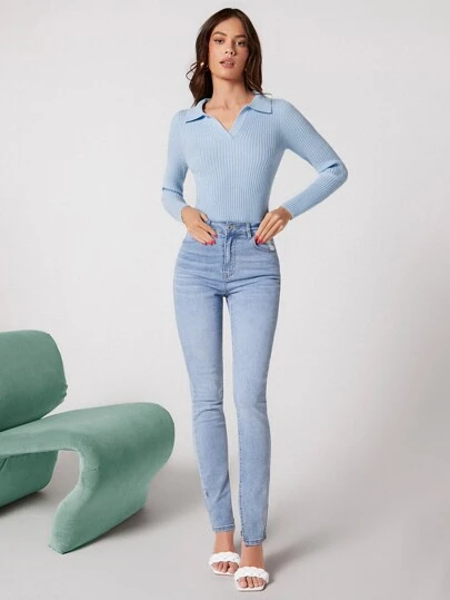 BizChic V-neck Solid Rib-knit Sweater - Dusty Blue - View 1