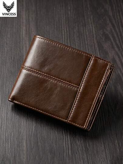 VINCESS Vintage Men's Genuine Cowhide Wallet, Classic Brown Bifold Design With Zipper Coin Compartment, Multi-Card Slots Money Organizer, Business Casual Style For Daily Commute & Travel