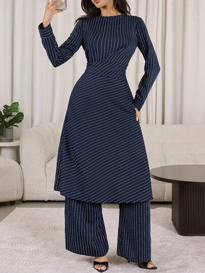 Veilorie Women's Fashion Commuter Striped Waist-Cinched Long Top And Long Pants Arabic Style Outfit