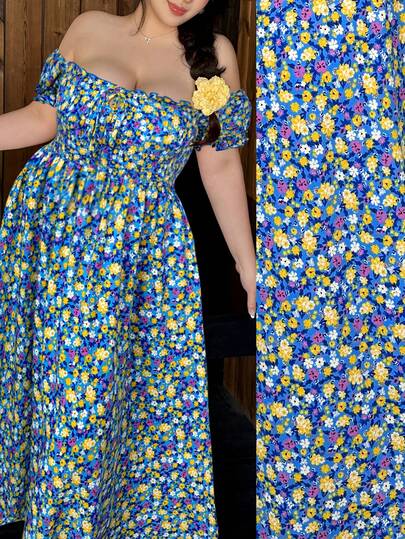 Plus Size Fashionable Casual Ditsy Floral Waist Cinched Dress