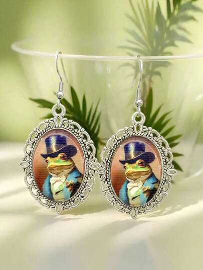 Vintage Gentleman Frog Drop Earrings - Oval Hollow Silver With Hat And Blue Suit - Imaginative Victorian Lady Jewelry