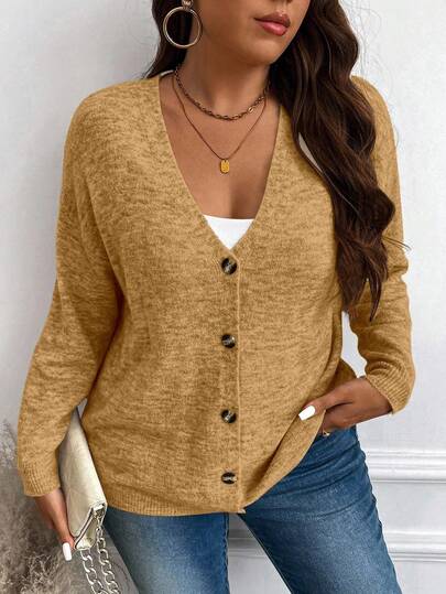 Vionelle Plusstorlek Dam Casual V-ringad Enfärgad Stickad Kofta - Kamel - Visa 1