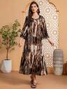 Elegant brun enfärgad rund halsringad långärmad klänning med fickor för kvinnor, lämplig för vardagsbruk